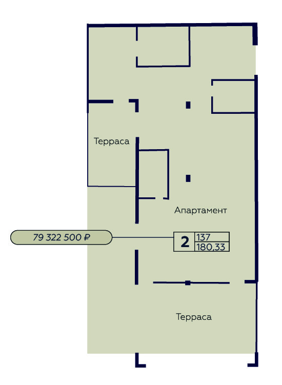 Трехкомнатная квартира европейского типа площадью 137 м² подойдет для небольшой семьи. Здесь есть родительская мастер-спальня с выходом на большую террасу, а просторная кухня-гостиная для уютных вечеров и детская имеют доступ на террасу меньшего размера.