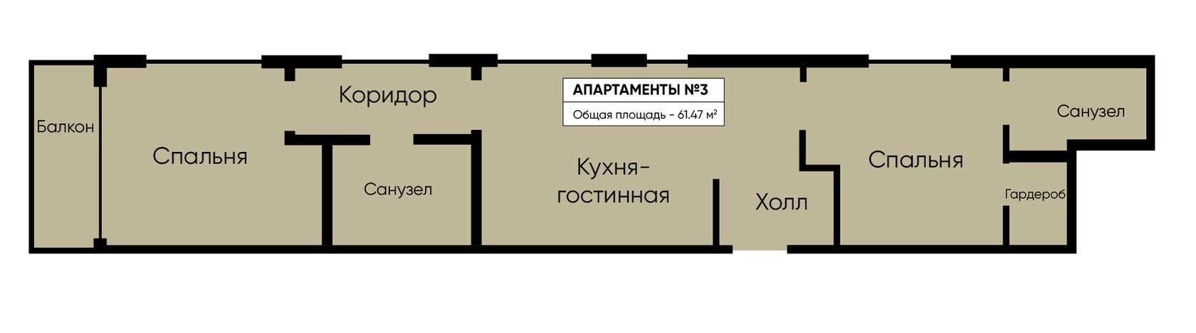 Двухкомнатные апартаменты европейского типа площадью 61,47 м². Заходя внутрь, вы попадаете в холл, из которого прямиком можно пройти на кухню-гостиную. Панорамные окна обеспечат естественное освещение в течение дня и роскошный вид на Волгу.